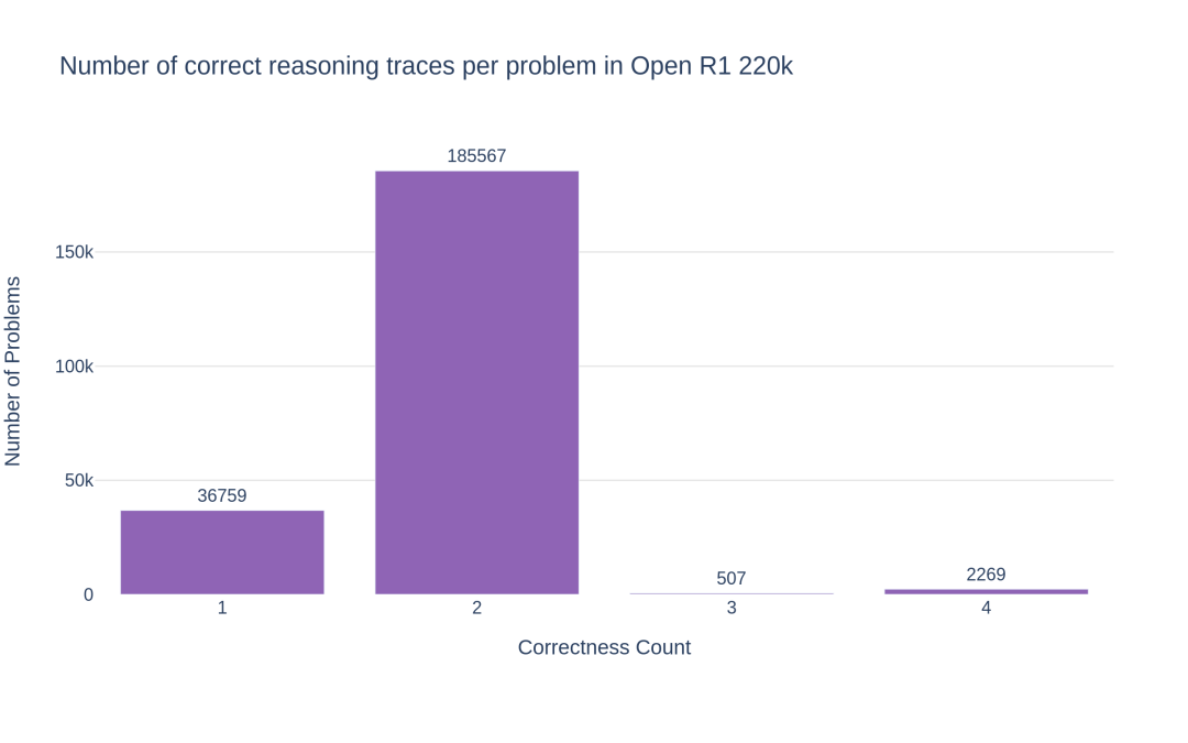 • 80 万条推理记录: 我们用为 40 万道题各生成了两个答案,筛完后剩下22 万道题,每道题都有靠谱的推理过程。