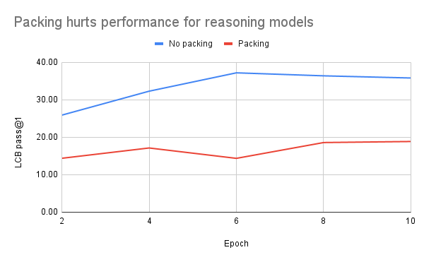 结果真如我们所料,下图清楚地显示,打包严重影响了模型表现: 用了打包,模型几乎解不出 LiveCodeBench 的问题; 不打包的话,性能会稳步提升,最后稳定下来: