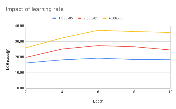 我们用 Qwen 模型做 SFT 实验时,通常学习率设在 2e-5 就够用了,效果也不错。但这次给现有instruct模型加推理数据时,我们发现把学习率调到 4e-5 能明显提升表现。下图显示,每次把学习率翻倍,LiveCodeBench 分数能涨差不多 10 分!