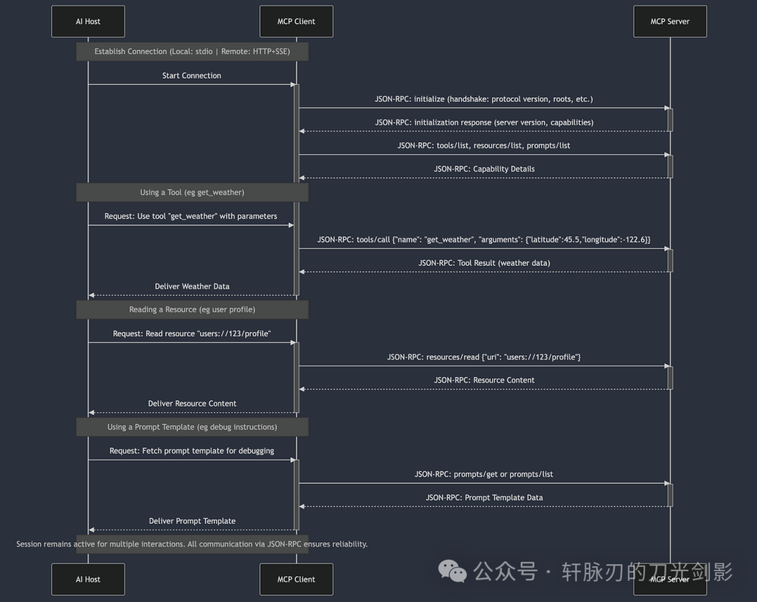 MCP Client 和 MCP Server 交互的时候,会分别通过tools/list,resources/list,prompts/list来获取这个 MCPServer 提供的哪些能力。