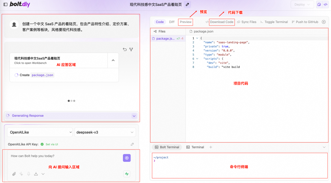 Bolt.new是stackblitz推出的一款AI编辑器,作为一个在线开发沙盒平台,结合了人工智能(AI)和WebContainers技术,其优势在于无需复杂配置即可在完整的开发环境下完成AI驱动的开发流程。但是由于Bolt.new是一个在线平台,因此它完全依赖于网络连接。在网络不稳定或中断的情况下,可能会导致开发流程中断或数据丢失。且虽然Bolt.new支持多种主流浏览器,但在某些特定浏览器或旧版本浏览器中可能会存在兼容性问题。这可能会限制某些开发者的使用。[1] Bolt.diy 是 Bolt.new 的一个开源版本,它提供了更高的灵活性和可定制性,通过自然语言交互简化开发流程,并提供全栈开发支持,同时允许用户二次开发。基于函数计算 FC 搭建并集成阿里云百炼模型服务,可以实现 Bolt.diy 的快速云端部署。 对于个人开发者,即便是无全栈开发经验也可快速上手,快速验证创意可行性;进一步可实现多模型对比、快速构建 AI 增强型应用;对于企业用户,还能够轻松实现内部业务系统与 AI 能力深度整合,定制 AI 解决方案! 本文旨在介绍如何将 Bolt.diy 部署到云上,通过云原生应用开发平台 CAP 构建 Web 服务,通过其提供的函数计算资源,结合百炼的模型服务能力,采用DeepSeek-v3实现代码生成,可即时查看生成的代码及运行预览效果,体验流畅高效的开发流程。借助 CAP还可以快速便捷地部署开源项目,而无需担心底层资源管理和运维问题,从而专注于应用的创新和开发。