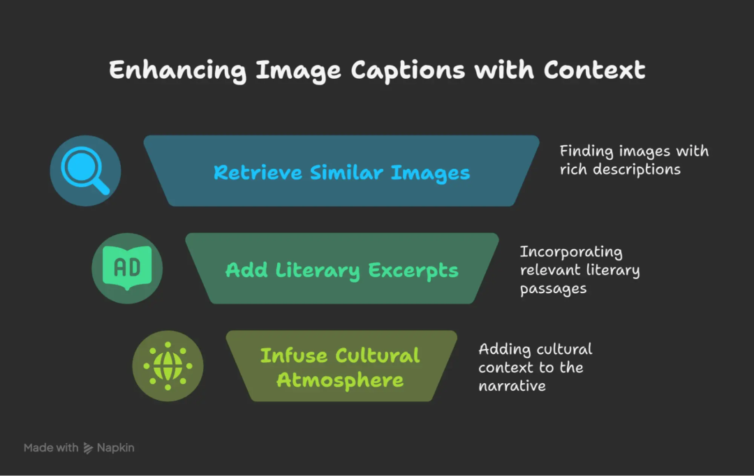 系统分析视觉元素,并根据收集到的信息检索描述、叙事风格和文化参考,生成富有情感和故事性的标题,而不仅仅是列举物体。