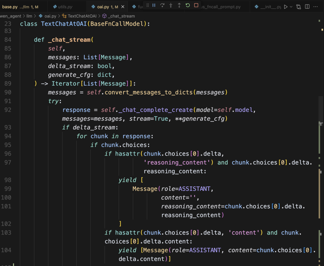 一种思路是如果存在tool_calls字段,则将相应工具调用指令提取出来,和content内容拼接在一起,适配Qwen Agent的解析引擎,这样后续Qwen Agent即可正常解析content字段中的工具调用指令,触发实际调用和多轮交互。代码如下所示,在oai.py代码中修改: