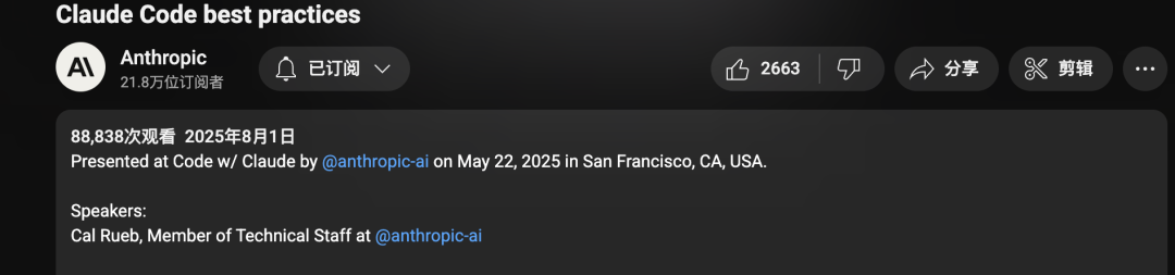 Claude Code 终于有了官方大佬出来分享内部的最佳实战哲学了。 两天前,Anthropic 官方 YouTube 账号放出了一个AI应用技术团队的老大在旧金山的 Code w/ Claude 会议上的分享内容。