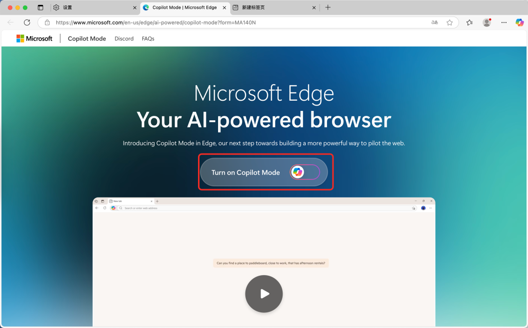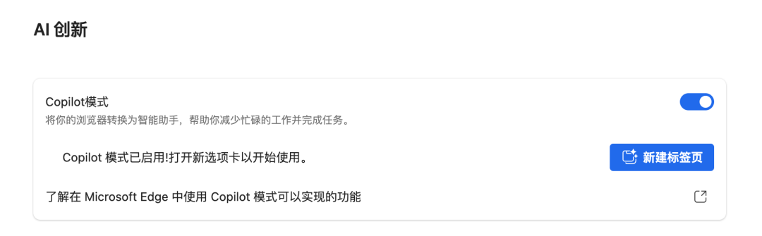 如果第一次使用Edge,AI创新的界面和这个不一致(忘截初始化界面效果了😂),可以先点击按钮进入微软官网,开启【Turn on Copiloot Mode】再回来查看,官网地址:https://www.microsoft.com/en-us/edge/ai-powered/copilot-mode?form=MA140N