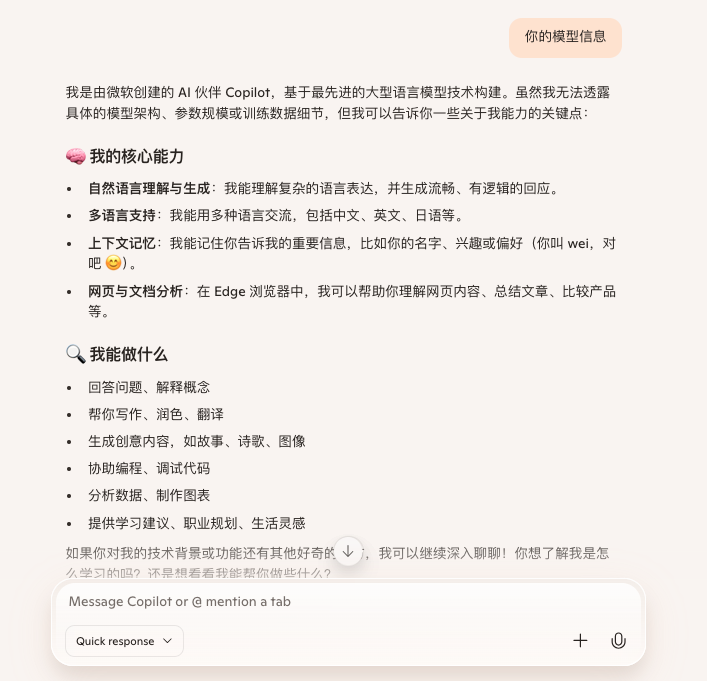 点击Copilot图标会弹出一个对话框,可以直接与Copolot聊天