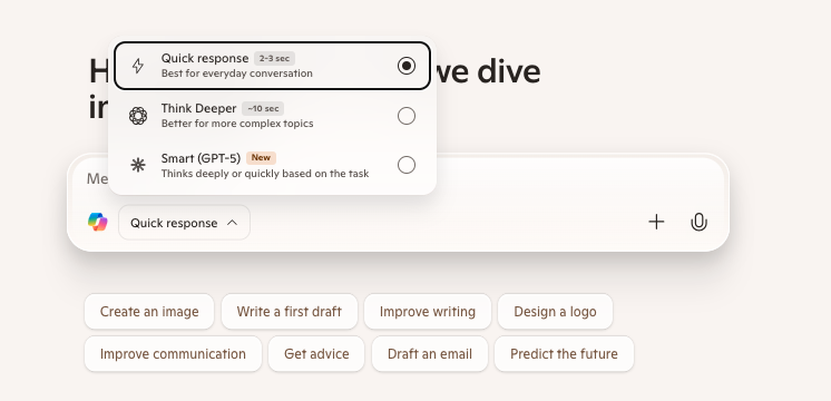 Copilot页面包含快速响应、深度思考、GPT-5、深度研究4中Chat模式