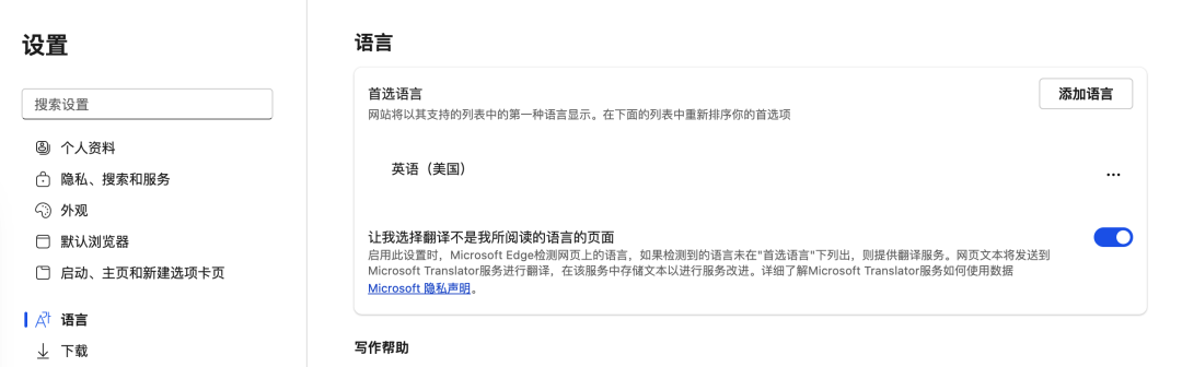 小溪的Edge一开始入口、Tab都是有的,第二天突然就看不到了,在微软官方开启Copilot提示上面的信息,再次检测浏览器版本是最新的而且是登录状态,尝试多次无果。如果你也遇到这个问题可以尝试我使用的方式,首先将科学上网环境配置为美国,Edge设置中将语言改为【英语 (美国)】