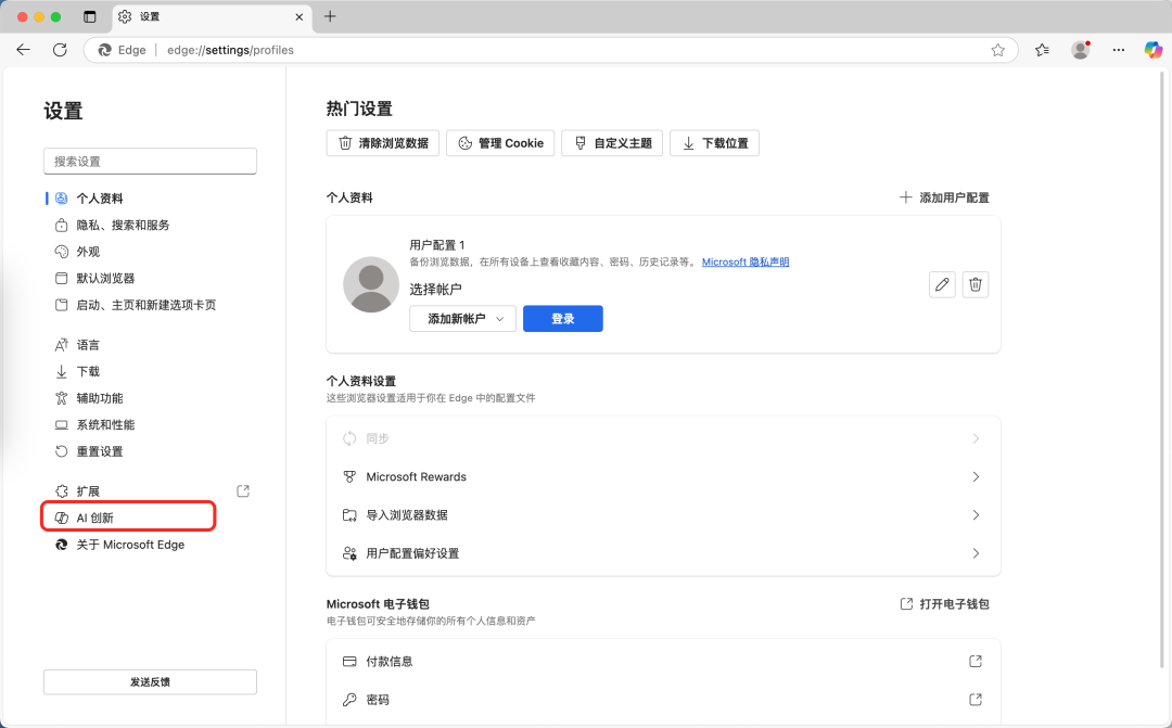 开启配置 进入Edge设置页面,可以看到多了一个【AI创新】的入口