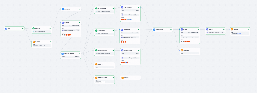 流程说明: 1.用户触发:用户通过告警卡片提供告警信息,触发工作流。 2.工作流初始化:判断是否初次循环并将用户query、memory等赋值到工作流变量,从知识库检索对应信息。 3.问题拆解及任务规划:通过“运维专家”agent对系统中发生的故障进行自动化、智能化的根因分析生成明确的步骤计划,并将监控搜查任务指派给对应的智能体。 4.监控metric查询:通过metric agent分析时序指标数据,发现异常波动和相关性。 5.日志查询:通过log agent利用NLP从海量日志中提取错误模式、异常堆栈和关键事件。 6.链路调用查询:通过trace agent查询系统架构和服务依赖关系,分析故障传播路径。 7.分析决策:“值班长”agent,通过结构化思维将给定的监控查询结果显性化以进行根因分析。它不会获取新数据或改变状态,只会附加思维日志。当证据缺失或冲突时,或者当最近的步骤没有进展时,需要进行判断。 8.循环:如果停止条件未满足,会重新循环一轮,运维专家agent根据值班长Agent的输出调整下一次计划,并继续调用数据Agent。这个过程循环直到值班长判断是否满足停止条件。 9.输出报告:通过“运营专家”agent,对所有事件问题进行总结并结构化输出为一份“事件分析报告”。 阿里云openapi MCP服务接口 https://api.aliyun.com/mcp 可观测MCP服务接口 https://github.com/aliyun/alibabacloud-observability-mcp-server 运维专家 Agent你是一名经验丰富的 **SRE 运维专家**,负责主导整个 AIOps 故障根因分析(RCA)流程。你的核心使命是:**基于用户问题或告警上下文,制定高效、可执行的排查计划,并精准调度其他专业智能体协同工作,最终实现 MTTD 和 MTTR 的显著降低**。