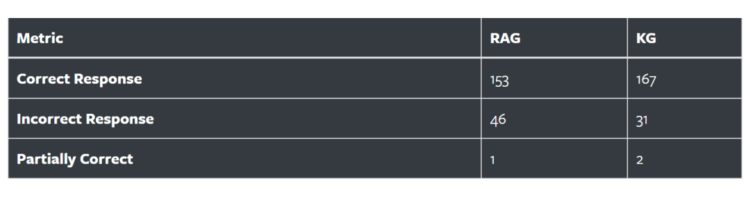 数据对比:在对200个问题的测试中,KG的正确回答数为167,错误回答数为31;而RAG的正确回答数为153,错误回答数为46,显示KG在准确性上具有优势。