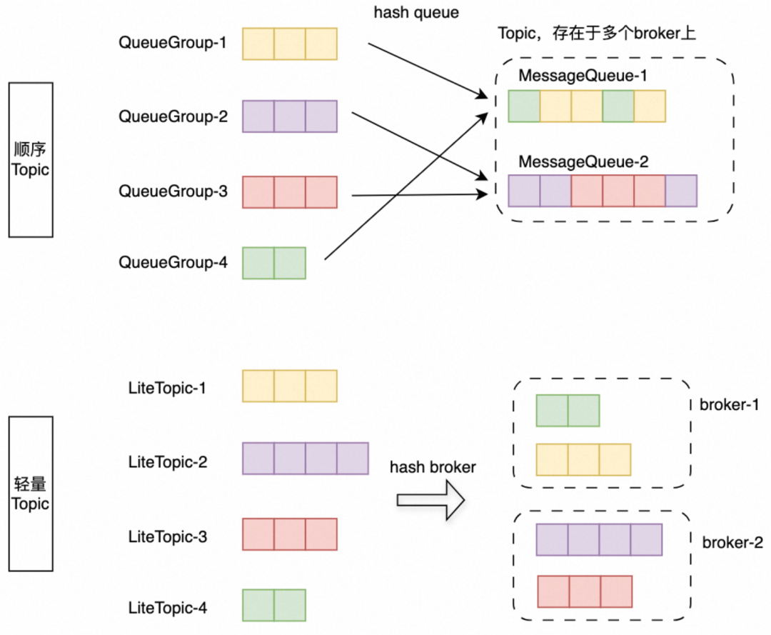1.4 LiteTopic 技术解析:百万队列支撑海量并发会话 LiteTopic 基于RocketMQ 业界领先的百万队列核心技术构建,其底层本质是独立的 Queue。 它为每个独立会话(Session)创建一个专属的、低成本的“私有通道”——即轻量主题(LiteTopic),从而能够以极低的资源开销支撑海量并发会话的需求。 轻量级的 LiteTopic 在消息分配与发送行为上与顺序 Topic 一致(其所属 Queue 由单一 Broker 独占,消息始终路由至该 Broker,而非在多个 Broker 间轮询发送),这种设计天然确保了消息的严格顺序性,并极大降低了资源管理和路由的复杂度。