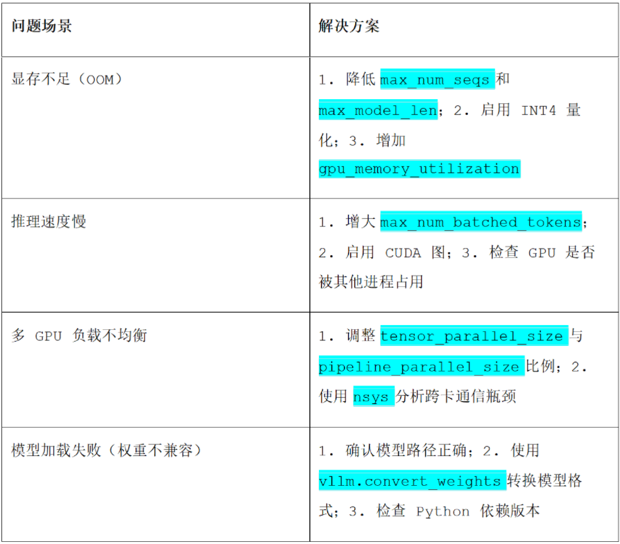 #张量并行(4卡部署70B模型)model=LLM(model_path="llama-3-70B",tensor_parallel_size=4)#管道并行与张量并行混合model=LLM(model_path="llama-3-70B",tensor_parallel_size=2,pipeline_parallel_size=2)