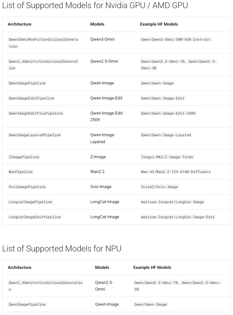N 卡上阿里 Qwen 能打的多模态模型及户全都支持,华为 NPU 也支持,只是可用模型较少