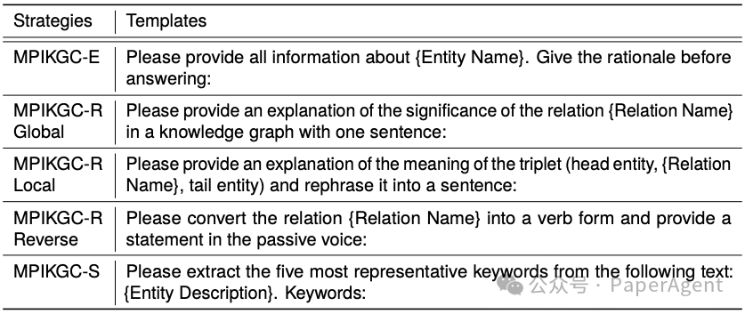 StrategiesTemplatesMPIKGC-EPleaseprovideallinformationabout{EntityName}.Givetherationalebeforeanswering:MPIKGC-RGlobalPleaseprovideanexplanationofthesignificanceoftherelation{RelationName}inaknowledgegraphwithonesentence:MPIKGC-RLocalPleaseprovideanexplanationofthemeaningofthetriplet(headentity,{RelationName},tailentity)andrephraseitintoasentence:MPIKGC-RReversePleaseconverttherelation{RelationName}intoaverbformandprovideastatementinthepassivevoice:MPIKGC-SPleaseextractthefivemostrepresentativekeywordsfromthefollowingtext:{EntityDescription}.Keywords: