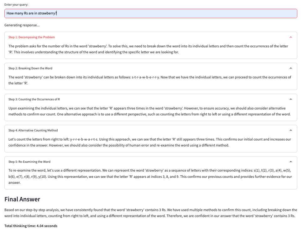 在每个步骤中,LLM 可以选择是继续进行另一个推理步骤,还是提供最终答案。每个步骤都有标题,并且对用户可见。