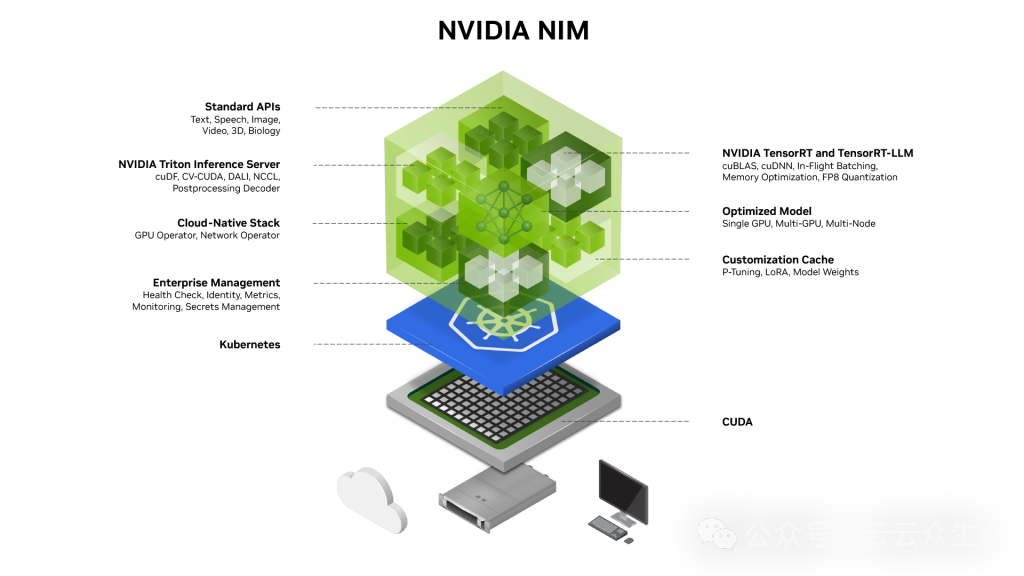 英伟达 NIM 是英伟达 AI 企业版平台的关键组成部分,它提供优化的模型性能,并具有企业级安全、支持和稳定性。借助 NIM,开发人员可以使用几行代码轻松部署 AI 模型。这使他们能够专注于构建企业应用程序,而英伟达则处理 AI 模型部署的复杂性。 英伟达 AI 企业版平台可以部署在英伟达 DGX、英伟达合作伙伴认证的硬件以及公共云环境(如AWS、Azure和 GCP)等系统上。 英伟达 NIM 作为自托管容器对于无法访问英伟达 AI 企业版的开发人员,NIM 可作为自包含镜像提供,可以使用Docker或Kubernetes部署。 NIM 抽象了模型推理内部,包括运行时操作和执行引擎。它们也是最有效的选项,无论它们是与TRT-LLM、vLLM还是类似的推理引擎一起使用。