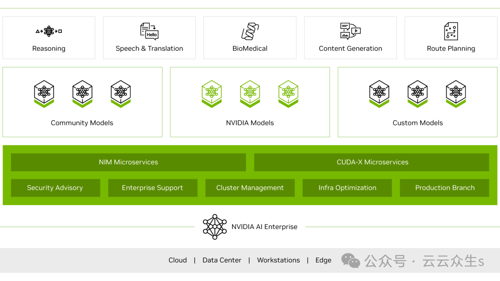 NVIDIA NIM 正在迅速成为开发者访问最新生成式 AI 模型的首选。最近,当Google推出Gemma 2 2B LLM 时,它与 Hugging Face 和 Kaggle 一起在 NIM 上提供了该模型。展望未来,您可以期待其他模型提供商在其 NVIDIA NIM 推理平台上提供其模型。 我将在本系列的后续教程中详细探讨 NIM API。 NVIDIA AI Enterprise 中的 NVIDIA NIM英伟达 AI 企业版是一个全面的、云原生软件平台,它可以加速数据科学管道,简化生产级副驾驶和其他生成式 AI 应用程序的开发和部署。作为该平台的一部分,英伟达 NIM 是一套易于使用的推理微服务,使开发人员能够在任何云或数据中心部署基础模型,同时保持其数据安全。 英伟达 AI 平台的软件层,英伟达 AI 企业版,加速了数据科学管道,简化了生产 AI 的开发和部署——包括生成式 AI、计算机视觉、语音 AI 等。凭借超过 100 个框架、预训练模型、开发工具和微服务,英伟达 AI 企业版旨在加速企业迈向 AI 的领先地位,同时简化 AI,使其对每家企业都触手可及。