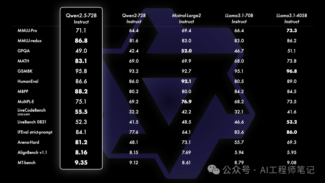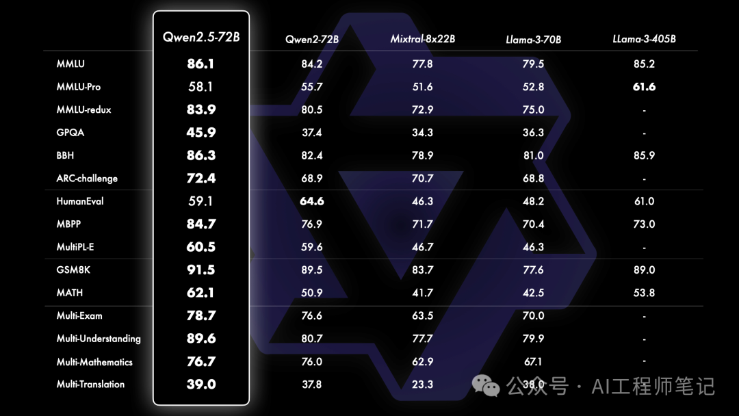ingFang SC", "Hiragino Sans GB", "Microsoft YaHei UI", "Microsoft YaHei", Arial, sans-serif;font-size: 1.2em;font-weight: bold;display: table;margin-right: auto;margin-bottom: 1em;margin-left: auto;padding-right: 1em;padding-left: 1em;border-bottom: 2px solid rgb(15, 76, 129);color: rgb(63, 63, 63);">通义千问Qwen2.5开源,媲美Llama3.1-405BingFang SC", "Hiragino Sans GB", "Microsoft YaHei UI", "Microsoft YaHei", Arial, sans-serif;font-size: 1.1em;font-weight: bold;margin-top: 2em;margin-right: 8px;margin-bottom: 0.75em;padding-left: 8px;border-left: 3px solid rgb(15, 76, 129);color: rgb(63, 63, 63);">介绍ingFang SC", "Hiragino Sans GB", "Microsoft YaHei UI", "Microsoft YaHei", Arial, sans-serif;margin: 1.5em 8px;letter-spacing: 0.1em;color: rgb(63, 63, 63);">就在今天早些时候,阿里发布了新的语言模型Qwen2.5,以及专门针对编程的Qwen2.5-Coder和数学的Qwen2.5-Math模型,包括:ingFang SC", "Hiragino Sans GB", "Microsoft YaHei UI", "Microsoft YaHei", Arial, sans-serif;padding-left: 1em;list-style: circle;color: rgb(63, 63, 63);" class="list-paddingleft-1"> •Qwen2.5: 0.5B, 1.5B, 3B, 7B, 14B, 32B, 以及72B; •Qwen2.5-Coder: 1.5B, 7B, 以及即将推出的32B; • Qwen2.5-Math: 1.5B, 7B, 以及72B。 ingFang SC", "Hiragino Sans GB", "Microsoft YaHei UI", "Microsoft YaHei", Arial, sans-serif;margin: 1.5em 8px;letter-spacing: 0.1em;color: rgb(63, 63, 63);">Qwen2.5 所有模型都在最新的大规模数据集上进行了预训练,该数据集包含多达18Ttokens。新模型在指令执行、生成长文本(超过 8K 标记)、理解结构化数据(例如表格)以及生成结构化输出特别是 JSON 方面取得了显著改进。Qwen2.5 模型总体上对各种system prompt更具适应性,增强了角色扮演实现和聊天机器人的条件设置功能。与 Qwen2 类似,Qwen2.5 语言模型支持高达128Ktokens,并能生成最多8Ktokens的内容。它们同样保持了对包括中文、英文、法文、西班牙文、葡萄牙文、德文、意大利文、俄文、日文、韩文、越南文、泰文、阿拉伯文等 29 种以上语言的支持。我们在下表中提供了有关模型的基本信息。ingFang SC", "Hiragino Sans GB", "Microsoft YaHei UI", "Microsoft YaHei", Arial, sans-serif;margin: 1.5em 8px;letter-spacing: 0.1em;color: rgb(63, 63, 63);">专业领域的编程模型Qwen2.5-Coder和数学模型Qwen2.5-Math,相比其前身 CodeQwen1.5 和 Qwen2-Math 有了实质性的改进。具体来说,Qwen2.5-Coder 在包含5.5 Ttokens 编程相关数据上进行了训练,使即使较小的编程专用模型也能在编程评估基准测试中表现出媲美大型语言模型的竞争力。同时,Qwen2.5-Math 支持中文和英文,并整合了多种推理方法,包括CoT(Chain of Thought)、PoT(Program of Thought)和 TIR(Tool-Integrated Reasoning)。ingFang SC", "Hiragino Sans GB", "Microsoft YaHei UI", "Microsoft YaHei", Arial, sans-serif;margin: 1.5em 8px;letter-spacing: 0.1em;color: rgb(63, 63, 63);">以下是整体的模型参数信息介绍: ingFang SC", "Hiragino Sans GB", "Microsoft YaHei UI", "Microsoft YaHei", Arial, sans-serif;font-size: 1.1em;font-weight: bold;margin-top: 2em;margin-right: 8px;margin-bottom: 0.75em;padding-left: 8px;border-left: 3px solid rgb(15, 76, 129);color: rgb(63, 63, 63);">模型性能ingFang SC", "Hiragino Sans GB", "Microsoft YaHei UI", "Microsoft YaHei", Arial, sans-serif;margin: 1.5em 8px;letter-spacing: 0.1em;color: rgb(63, 63, 63);">Qwen2.5-72B在多个基准测试中展示了经过指令调优的版本的综合结果,评估了模型的能力和人类偏好。从评测结果可以看到全方位领先Llama3.1-70B,甚至在部分优于Llama3.1-405B。 ingFang SC", "Hiragino Sans GB", "Microsoft YaHei UI", "Microsoft YaHei", Arial, sans-serif;margin: 1.5em 8px;letter-spacing: 0.1em;color: rgb(63, 63, 63);">Qwen2.5-72B的基础语言模型性能达到了顶级水准,同样是在与 Llama-3-405B 这样更大的模型对比时也不落下风。
