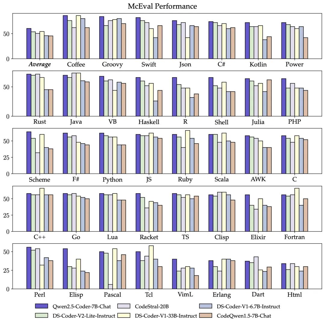 Qwen2.5-Coder 是为编程特别设计的模型,基准测试数据如下: