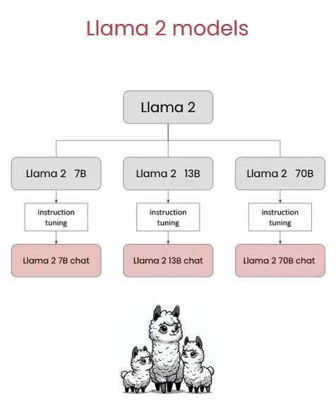通过之前的课程内容,我们知道Llama2里面有很多种不同的模型,包括预训练的Llama 2 7-70B以及经过指令微调的chat模型。