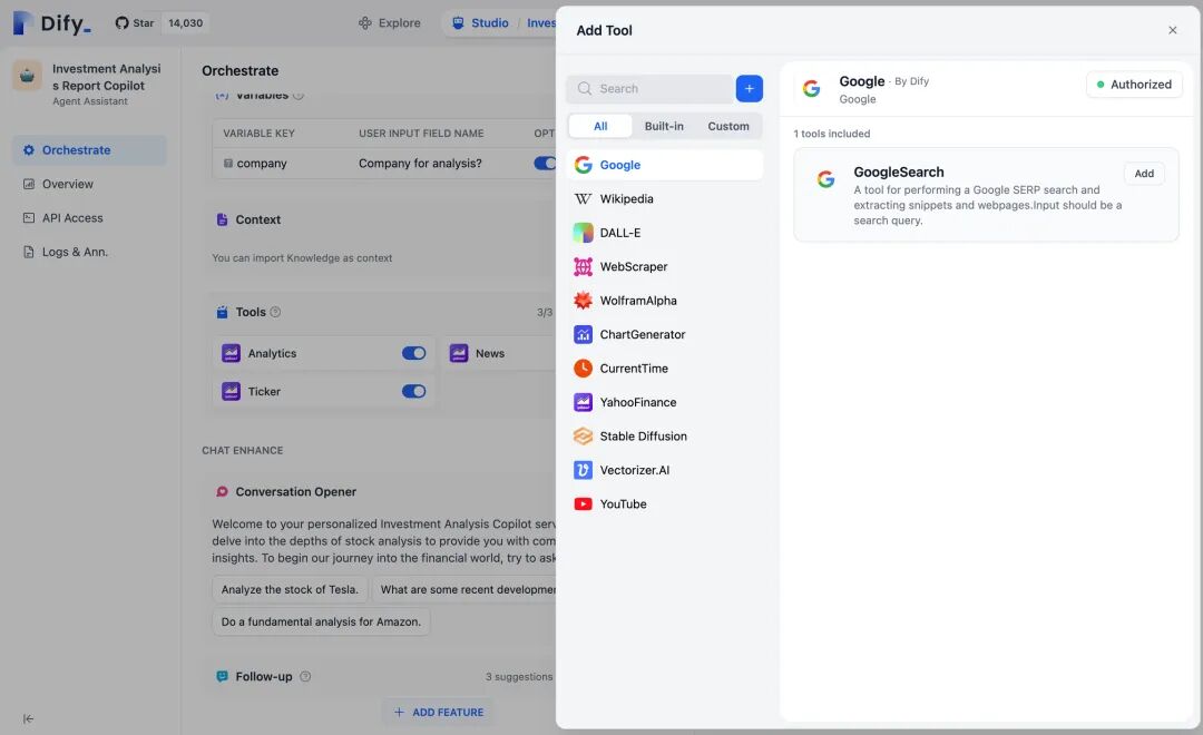 Dify平台提供了丰富的“探索”(Explore)部分,其中包含多个代理助理的应用模板。用户可以直接将这些模板集成到自己的工作区中,快速开始使用。同时还允许用户创建自定义代理助理,以满足特定的个人或组织需求。