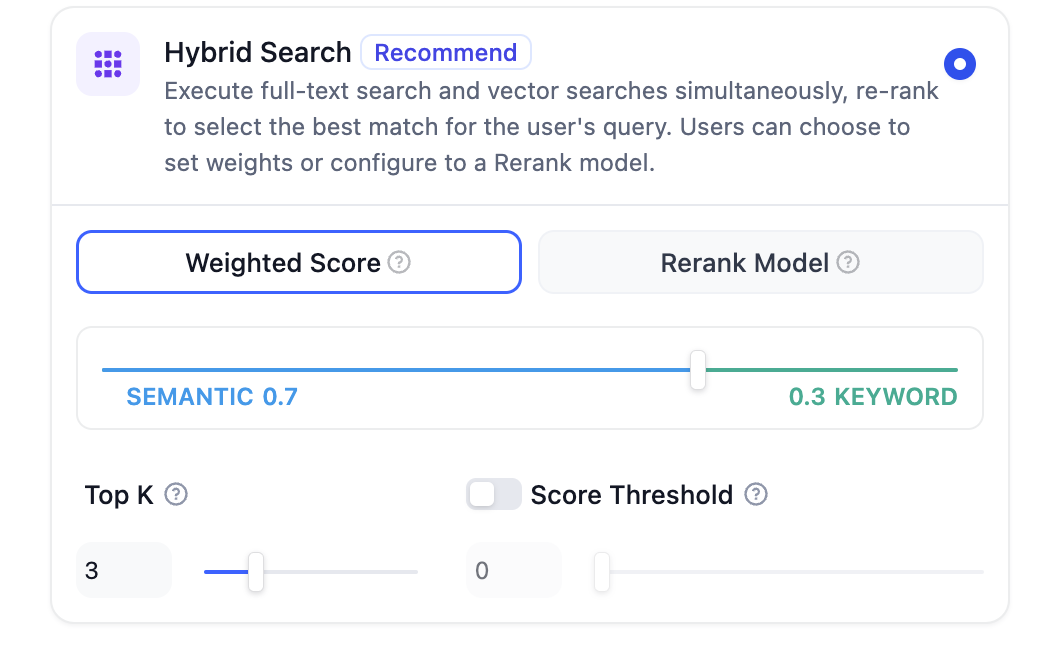 • TopK和分数阈值:设置检索结果的数量和相似度阈值。