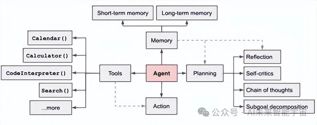 1. 规划(Planning): 规划模块利用大模型的推理和规划能力,将复杂任务进行拆解和评估,形成若干个可实现的简单任务。比如在物流配送中规划最优路线、在项目管理中安排任务顺序等。当任务目标明确,但实现路径不清晰时,规划模块能够发挥重要作用。 2. 记忆(Memory): 记忆模块可以采用数据库技术,如关系型数据库、非关系型数据库等,来存储会话上下文和长期记忆。同时,可以利用知识图谱技术来构建和管理长期记忆,以便更好地组织和检索信息。 对于需要记录和检索大量信息的场景,如客户服务中记录用户的历史问题和解决方案、医疗健康中存储患者的病历和治疗记录等。在需要根据历史数据进行决策的场景中,记忆模块至关重要。 3. 工具(Tools): 工具模块包括各种外部API调用、插件等,如自然语言处理API、数据分析工具插件、图像识别API等。这些工具可以通过接口调用的方式与大模型Agent进行集成。此外,通过Function Calling可以更加灵活地调用这些工具,根据具体需求获取特定信息或执行特定任务。 例如,在金融服务中调用数据分析工具进行风险评估、在教育中调用自然语言处理工具进行文本分析等。当大模型Agent需要获取外部信息或执行特定任务时,工具模块可以提供有力支持。 4. 行动(Action): 行动模块可以通过与外部系统的接口进行交互,如调用操作系统的命令、与网络服务进行通信等。同时,可以利用机器人技术来实现物理层面的行动,如机器人执行任务。 例如,在工业自动化中控制机器人执行生产任务、在智能家居中与设备进行交互等。当大模型Agent需要将决策转化为实际行动时,行动模块负责具体的执行。