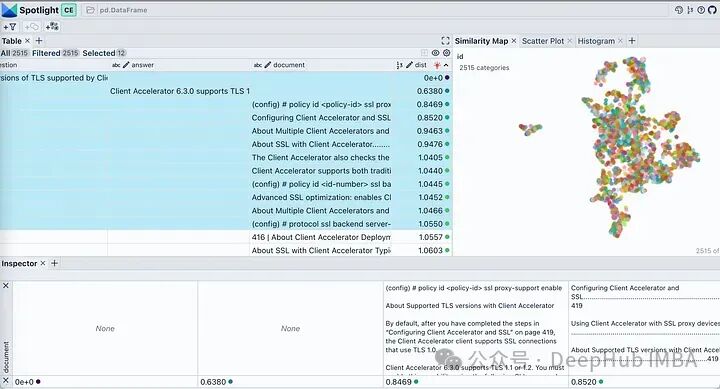 visualize_distance(db,query,result["result"]) 向量空间可视化本身是由上面代码中的最后一行visualize_distance处理的: visualize_distance访问FAISS对象的属性__dict__,index_to_docstore_id本身是值docstore-ids的关键索引字典,用于向量化的总文档计数由索引对象的属性ntotal表示。 vs = db.__dict__.get("docstore") index_list = db.__dict__.get("index_to_docstore_id").values() doc_cnt = db.index.ntotal调用对象索引的方法reconstruct_n,可以实现向量空间的近似重建 embeddings_vec=db.index.reconstruct_n() 有了docstore-id列表作为index_list,就可以找到相关的文档对象,并使用它来创建一个包括docstore-id、文档元数据、文档内容以及它在所有id的向量空间中的嵌入的列表: doc_list = list() for i,doc-id in enumerate(index_list): a_doc = vs.search(doc-id) doc_list.append([doc-id,a_doc.metadata.get("source"),a_doc.page_content,embeddings_vec[i]]) 然后使用列表创建一个包含列标题的DF,我们最后使用这个DF进行可视化 df=pd.DataFrame(doc_list,columns=['id','metadata','document','embedding']) 在继续进行可视化之前,还需要将问题和答案结合起来,我们创建一个单独的问题以及答案的DF,然后与上面的df进行合并,这样能够显示问题和答案出现的地方,在可视化时我们可以高亮显示: # add rows for question and answer embeddings_model = HuggingFaceEmbeddings() question_df = pd.DataFrame( { "id": "question", "question": question, "embedding": [embeddings_model.embed_query(question)], }) answer_df = pd.DataFrame( { "id": "answer", "answer": answer, "embedding": [embeddings_model.embed_query(answer)], }) df = pd.concat([question_df, answer_df, df]) 这里使用使用np.linalg.norm在文件和问题嵌入上的进行距离大小的计算: question_embedding = embeddings_model.embed_query(question) # add column for vector distance df["dist"] = df.apply( lambda row: np.linalg.norm( np.array(row["embedding"]) - question_embedding ),axis=1,) 因为spotlight可以对df进行可视化,所有我们直接调用即可 spotlight.show(df) 这一步将在浏览器窗口中启动spotlight。 运行测试1、基本测试 下面是我们选择的样本问题: What versions of TLS supported by Client Accelerator 6.3.0?