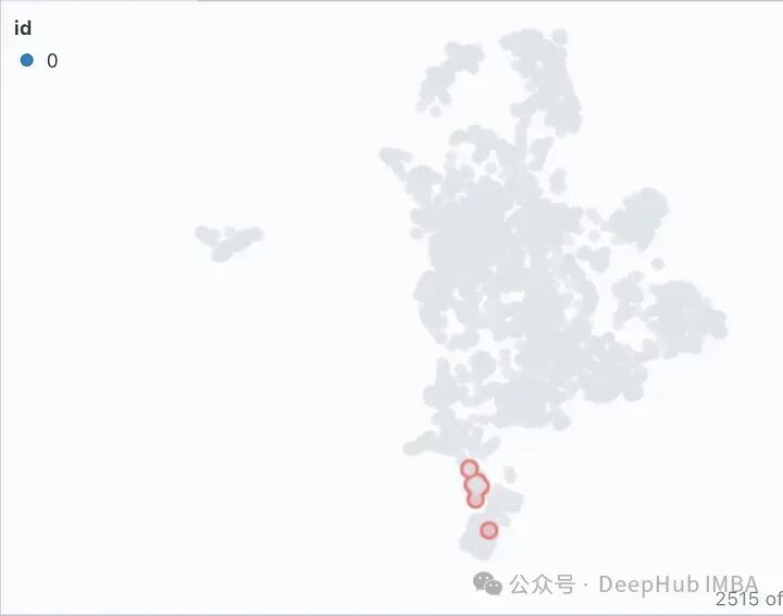 在可以spotlight中使用visible 按钮来控制显示的列。按“dist”对表格进行排序,在顶部显示问题、答案和最相关的文档片段。查看我们文档的嵌入,它将几乎所有文档块描述为单个簇。这是合理的,因为我们原始pdf是针对特定产品的部署指南,所以被认为是一个簇是没有问题的。 单击Similarity Map选项卡中的过滤器图标,它只突出显示所选的文档列表,该列表是紧密聚集的,其余的显示为灰色,如图下所示。