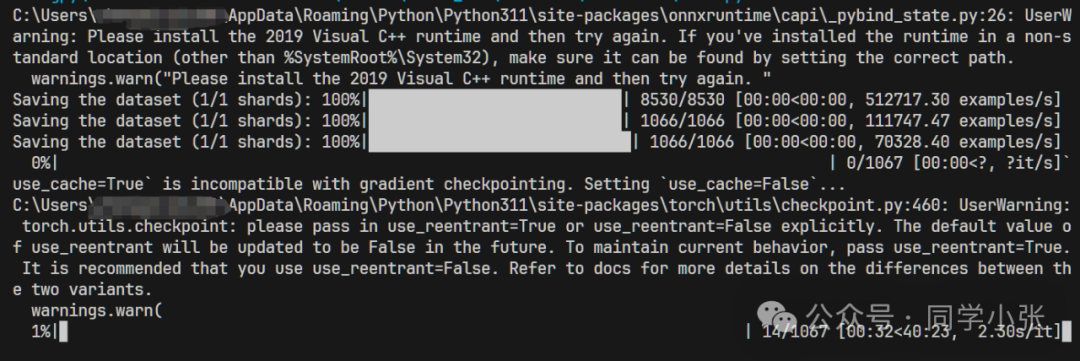运行成功后的样子如下,会显示当前训练进度、预计耗时等: